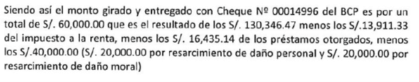 – Asimismo, de la cláusula cuarta del acotado documento, la demanda manifestó que a modo unilateral entregó al demandante la suma de S/ 130 346.47 a título de liberalidad, monto que compensa cualquier monto que pudiera reclamarse por pago de beneficios sociales u otros pagos como indemnizaciones