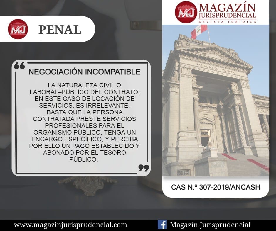 SEXTO. Que este Tribunal de Casación en varias sentencias ya fijó doctrina legal sobre el tipo delictivo de negociación incompatible. Así, entre otras, cabe citar la sentencia casatoria 396-2019/Ayacucho, de nueve de noviembre de dos mil veinte, y específicamente la sentencia casatoria 180-2020/La Libertad, de siete de diciembre de dos mil veinte. ∞ El artículo 399, del Código Penal castiga al: “[…] funcionario o servidor público que indebidamente en forma directa o indirecta o por acto simulado se interesa, en provecho propio o de tercero, por cualquier contrato u operación que interviene por razón de su cargo, […]”. ∞ Así, ratificando lo expuesto en estas sentencias, cabe reiterar lo siguiente: “1. El delito de negociación incompatible protege la expectativa normativa de que el funcionario público ha de actuar en resguardo de los intereses de la Administración Pública, evitando cualquier situación de interferencia en la toma o ejecución de decisiones. El funcionario público, en este caso, abusa del cargo que ejerce con el fin de obtener un provecho propio o para un tercero. 2. Es tanto un delito especial propio (formal) cuanto un delito de infracción de deber (material): el agente oficial ha de haber actuado en el proceso de contratación pública, en cualquier etapa de ella, con base a un título habilitante y con capacidad de decisión (facultades y competencias para intervenir en ese proceso), por lo que se trata de una situación de prevalimiento –el fundamento de la imputación responde en la infracción del deber positivo del agente oficial de resguardar los intereses de la Administración a través de una actuación imparcial en un contrato u operación estatal en la que interviene por razón de su cargo [ÁLVAREZ DÁVILA, FRANCISCO: Delitos contra la Administración Pública, Editorial Ideas, Lima, 2020, p. 133]. 3. Solo se requiere que el agente oficial actúe interesadamente, por lo que se está ante un delito de peligro abstracto; es decir, el comportamiento descripto en el tipo penal describe una conducta cuya realización, se presume, crea un peligro para el bien jurídico; se sanciona un comportamiento por una valoración ex ante, en cuya virtud el legislador presume, sin prueba en contrario, que la consecuencia de la conducta típica es la afectación del bien jurídico. Luego, el logro de un beneficio económico, propio o de un tercero, no forma parte del tipo penal; no se exige un resultado de lesión o un resultado de peligro (peligro concreto), solo ha de probarse la tendencia final del mismo hacia ese logro –no solo se exige el dolo sino además un elemento subjetivo de tendencia: búsqueda de un provecho propio o de un tercero–. 4. El aludido tipo delictivo puede calificarse, incluso, como un delito preparatorio en relación con el delito de colusión –ambos tienen su fundamento en deberes especiales atribuidos a los agentes oficiales y están vinculados a contratos u operaciones estatales–, pero protege el mismo bien jurídico bajo la infracción de normas de flanqueo –no de las normas principales– en relación al mismo bien jurídico. Es, por tanto, un injusto parcial en relación con el delito de colusión. 5. Desde la acción típica, el interés indebido –directo o indirecto–, entendido siempre económicamente a tono con el objeto del tipo penal –incluso de su fuente argentina, artículo 265 originario del Código Penal–, importa de parte del agente oficial un aprovechamiento del cargo –un acto de injerencia– para hacer prevalecer los intereses particulares (propios o ajenos) frente a los intereses de la Administración. Su contenido es volcar sobre el negocio de que se trate, en cualquiera de sus fases (actos preparatorios, ejecución o liquidación del contrato) y, claro, puede incluir un ámbito muy variado de expresiones prácticas [SALINAS SICCHA, RAMIRO: Delitos contra la Administración Pública, 3ra. Edición, Editorial Grijley, Lima, 2014, p. 567], una pretensión de parte no administrativa, sin perjuicio de la concurrencia, o no, del interés de la administración pública a la cual el funcionario público debe dar preminencia en función del cargo que ocupa. 6. El agente oficial hace intervenir en el contrato u operación un interés propio y particular, se sitúa ante ellos no sólo como funcionario, sino, conjuntamente, como particular interesado en una determinada decisión o actuación de la administración. ∞ El interés indebido, como afirma CREUS, es situarse ante el contrato u operación administrativa no sólo como funcionario, sino, conjuntamente, como particular interesado en una determinada decisión o actuación de la administración –por eso se habla de un desdoblamiento del agente–. Interesarse es volcar sobre el negocio de que se trate una pretensión de parte no administrativa; querer que ese negocio asuma una determinada configuración en interés particular del sujeto, o hacer mediar en él, propugnándolos, intereses particulares del tercero [CREUS, CARLOS: Derecho Penal – Parte Especial, Tomo Dos, Editorial Astrea, Buenos Aires, 1999, p. 299]”.